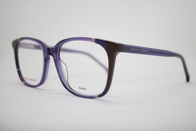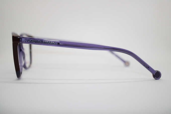 Aro de la marca Carolina Herrera en acetato color morado traslucido con detalles café