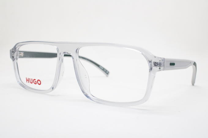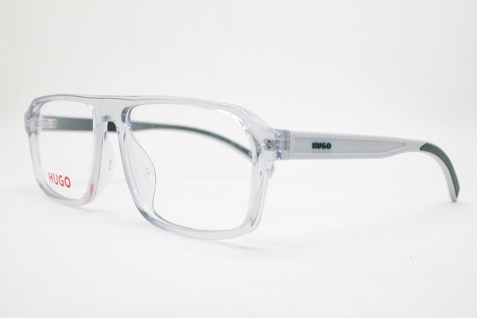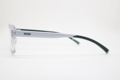 Aro de la marca Hugo Boss en acetato color gris traslucido con detalles en tono verde matte