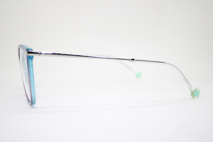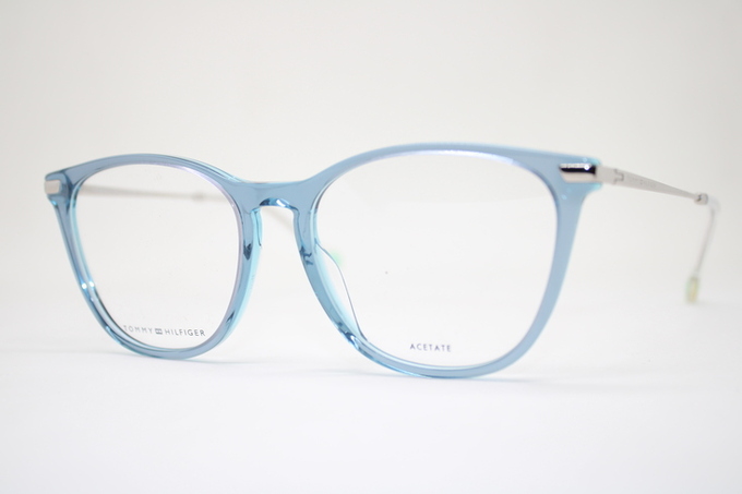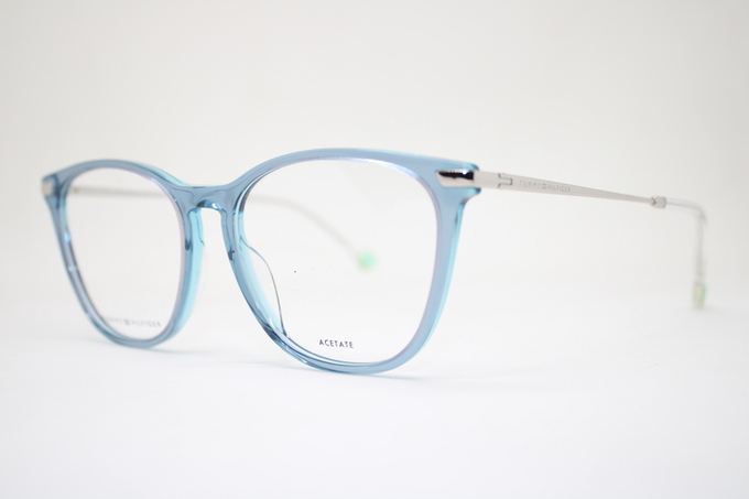 Aro de la marca Tommy Hilfiger en acetato color celeste semi traslucido con detalles en plateado