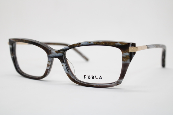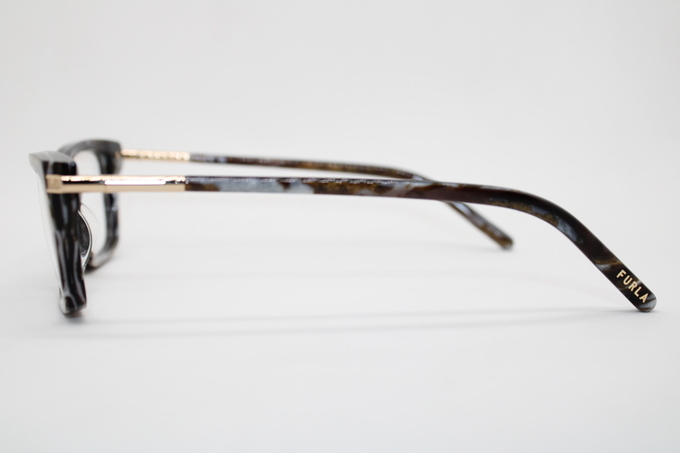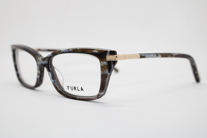 Aro de la marca Furla en acetato en tono café tortoise con detalles en celeste y tonos dorados