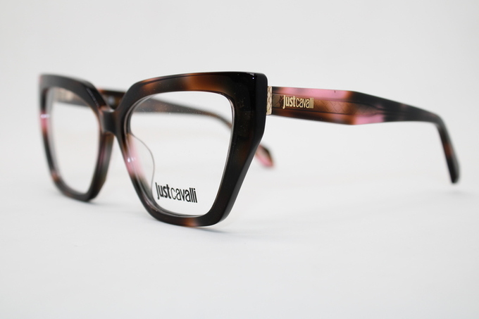 Aro de la marca Just Cavalli en acetato en tono café tortoise con detalles rojo rosa y dorado