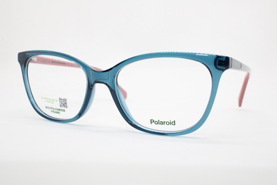 Aro de la marca Polaroid en acetato color azul traslucido con detalles rosados